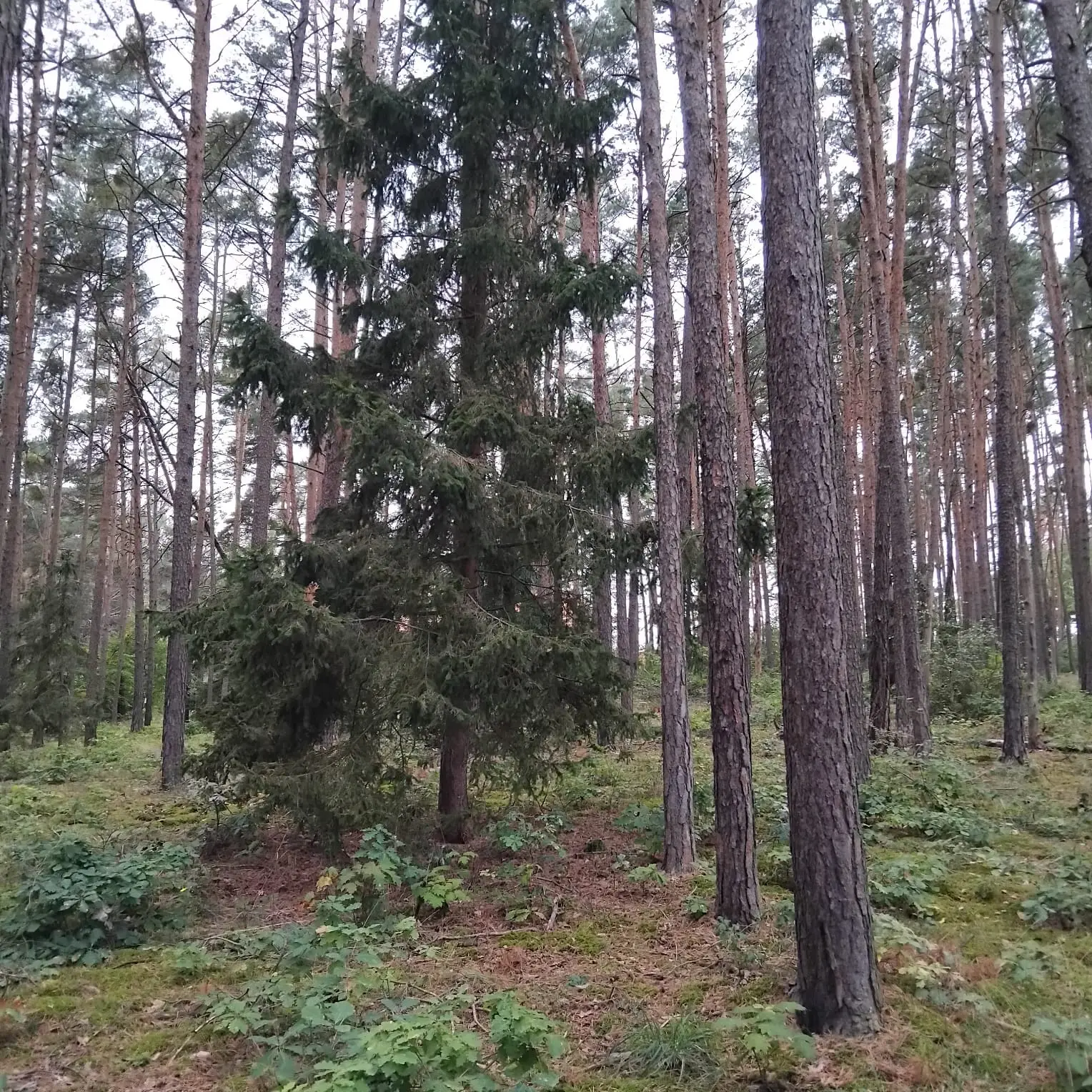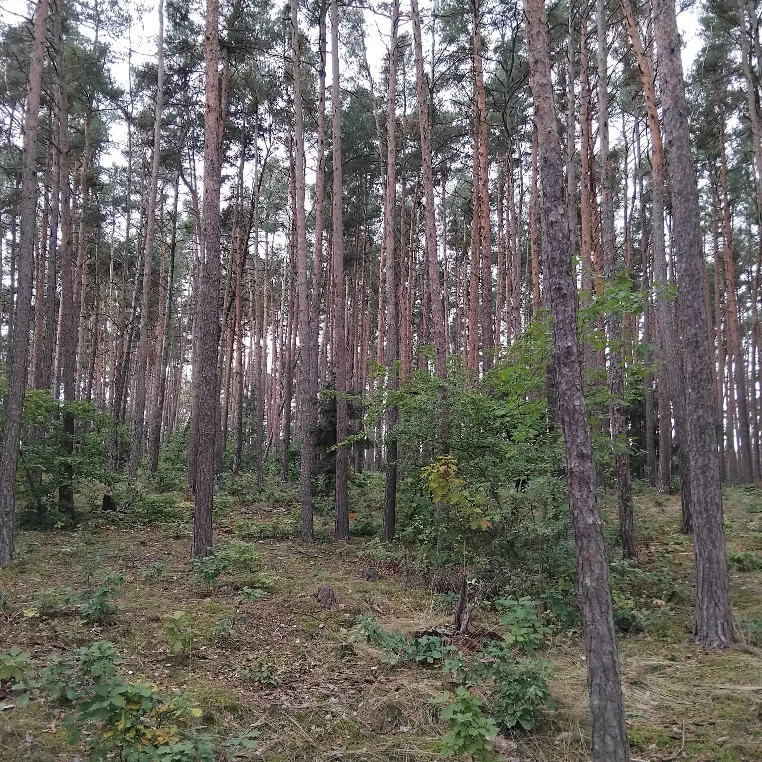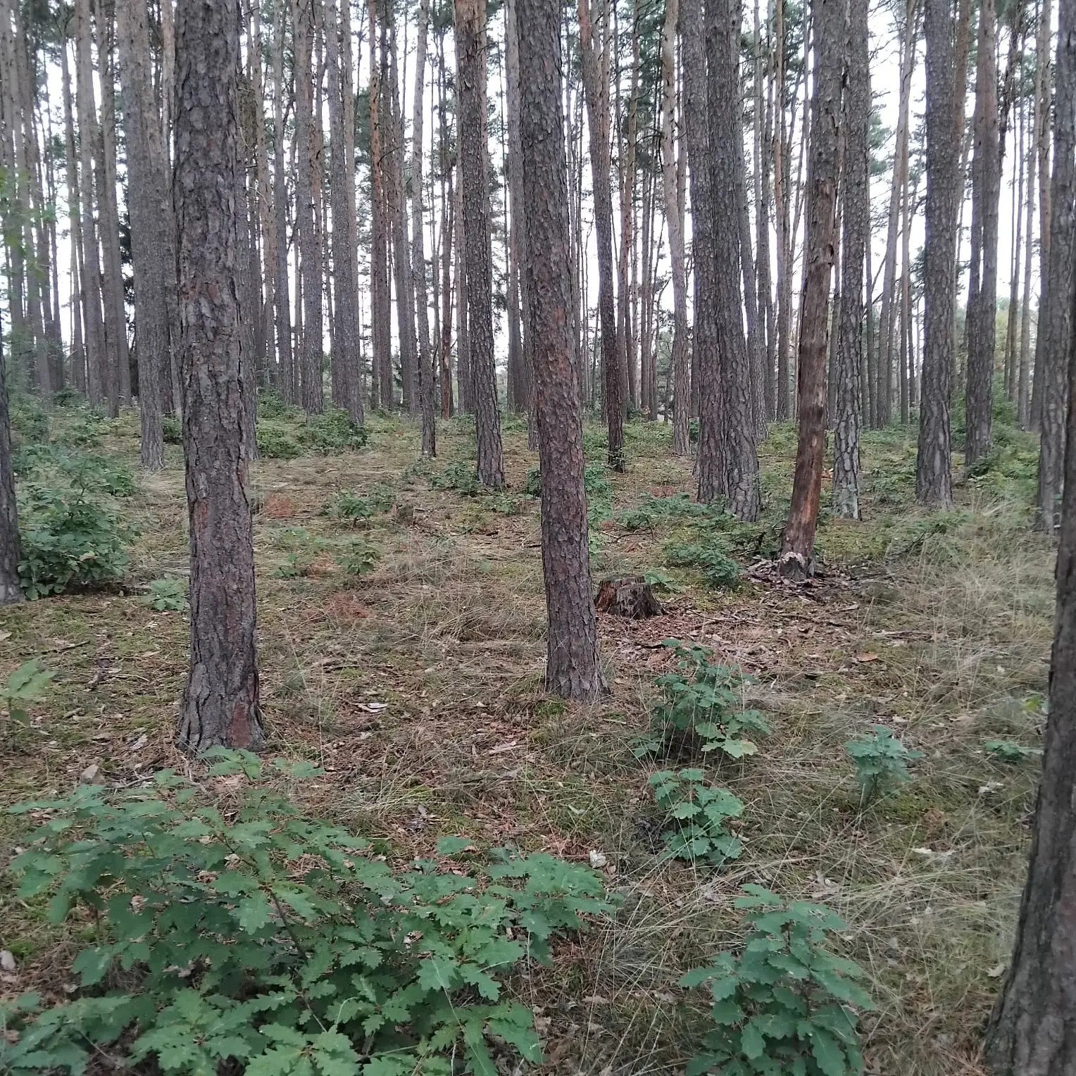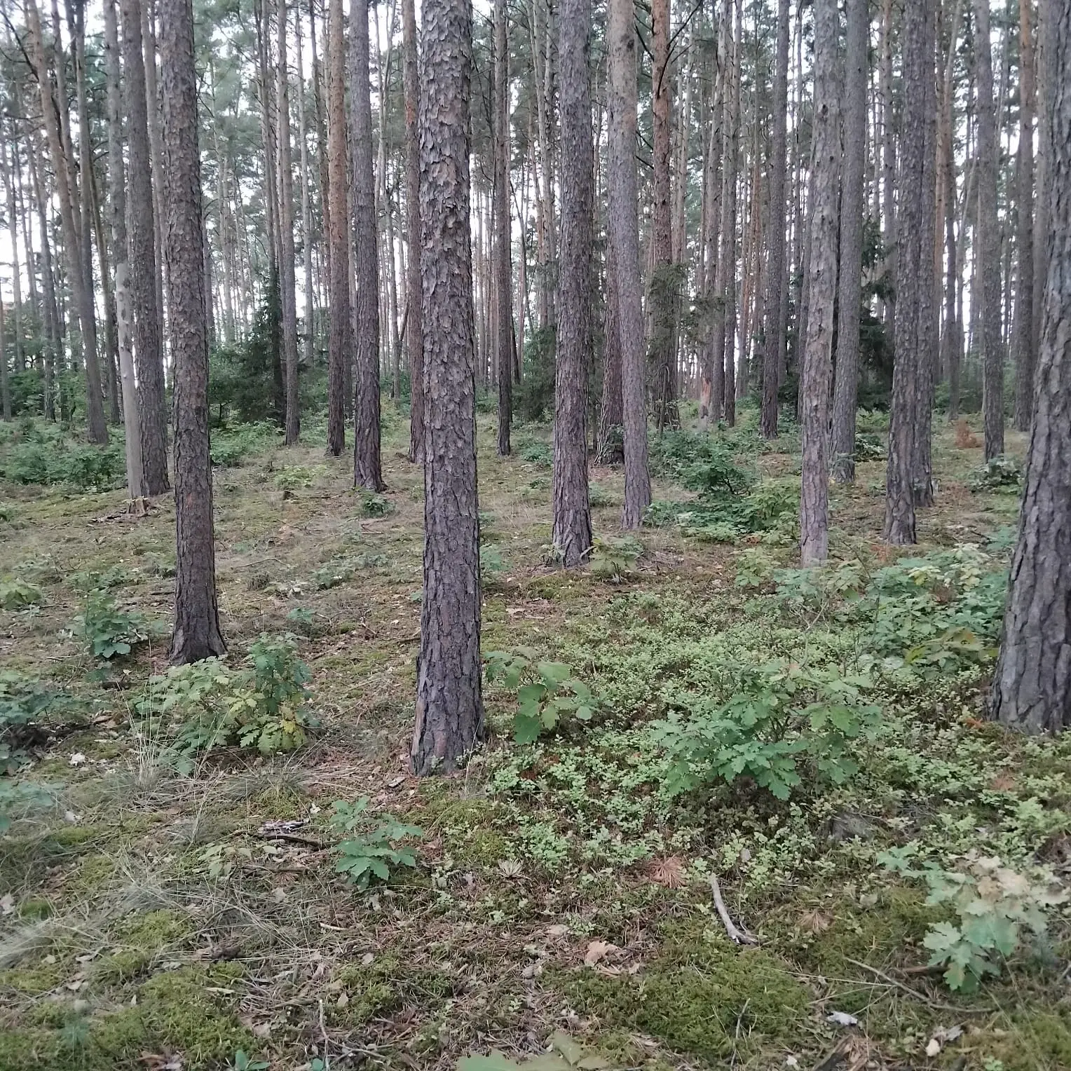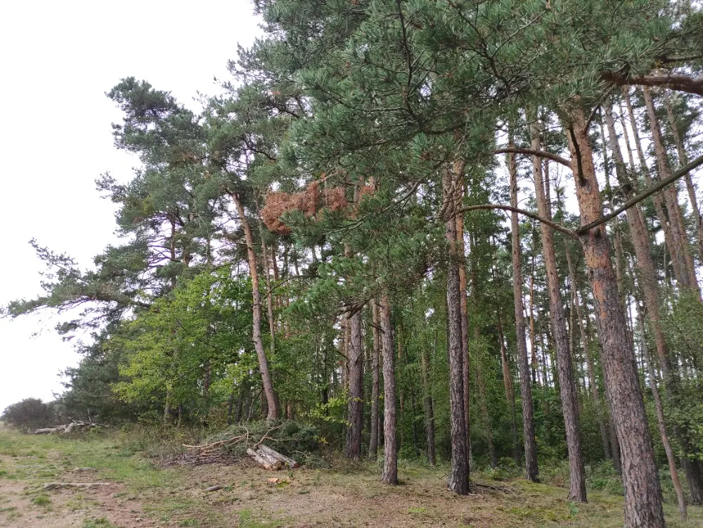 V "pohodlném" vzrostlém lese, vysazeném v roce 1940, se ukazuje i mech, rostou houby, borůvky, na kraji na jednom stromě je i jmelí, je vidět dostatečná vlhkost, nikde ale není přemokřeno. Ten les je prostě krásný a osvěžující, cítíte se v něm dobře, v létě příjemně voní borovice. Je to rovina.