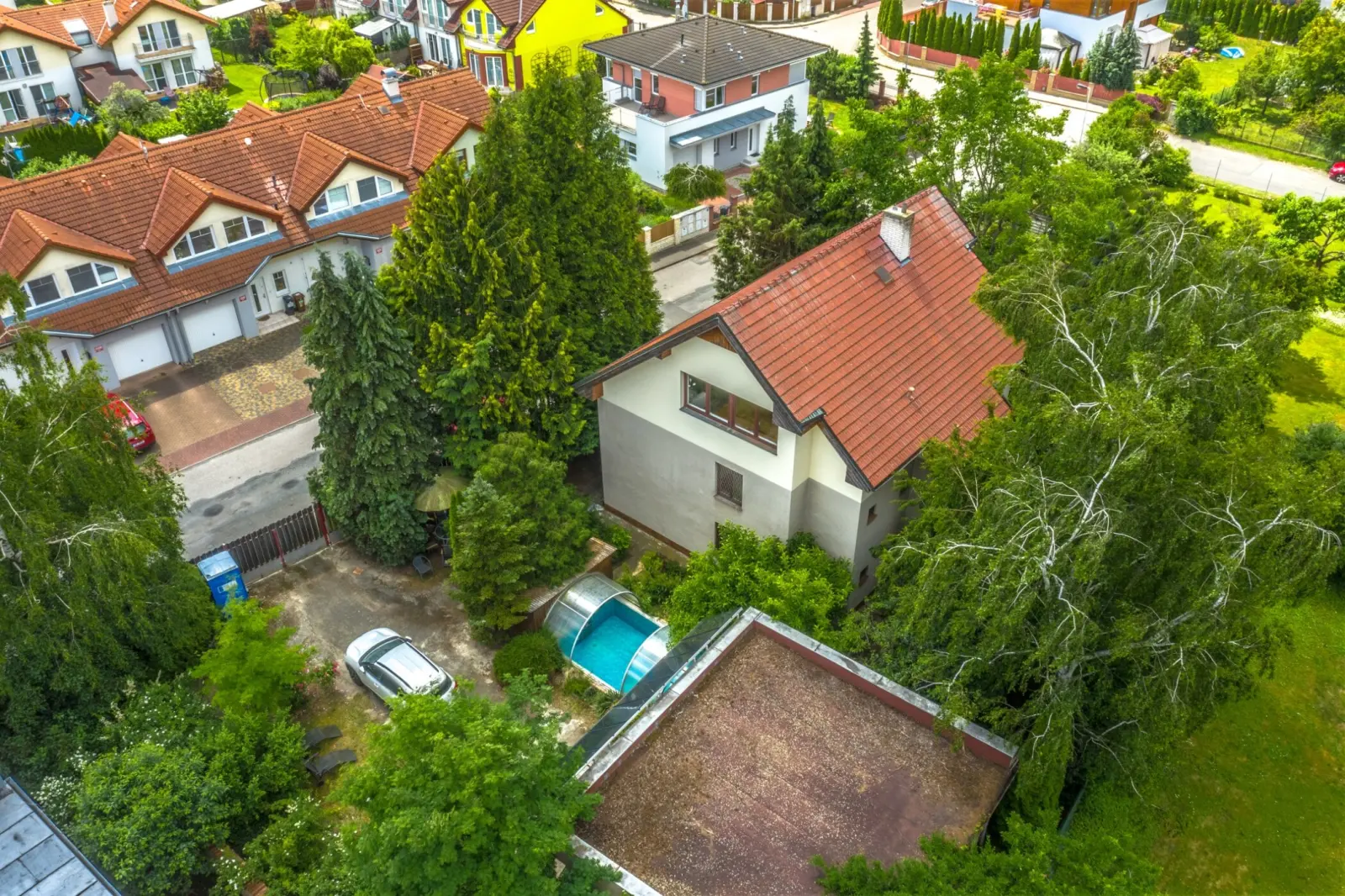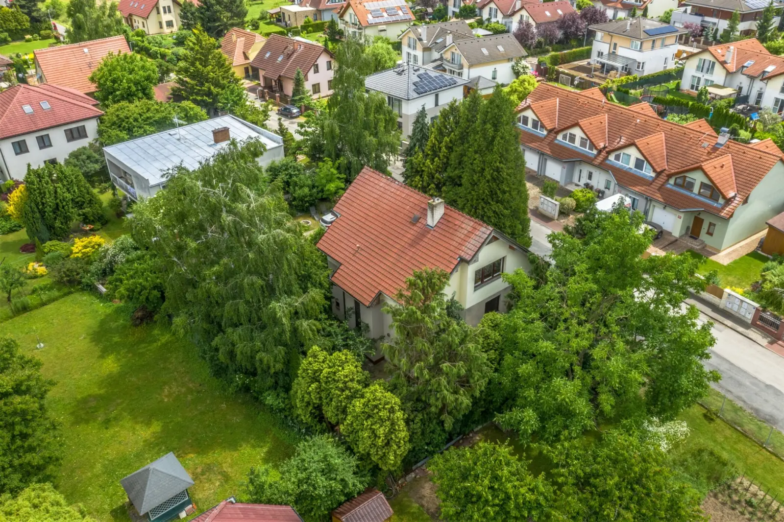 Přesto, že rozměry podlaží jsou víc jak 90 m2, dům nepůsobí neúměrně velikým dojmem. Je obklopen vzrostlou zelení, která cloní dům i soukromí.