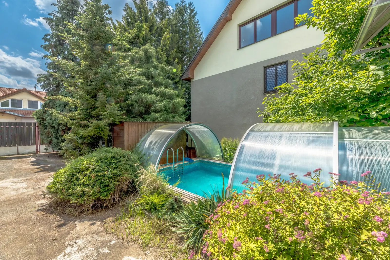 Bazén je vytápěn slunečními kolektory a má zabudován protiproud. Kolektory mohou ohřívat také vodu v domě, ale jen na mytí, ne na vytápění, pro to není teplota dostatečně vysoká.